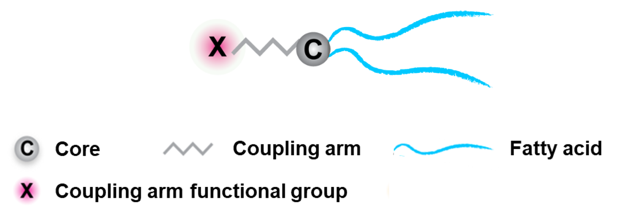 Typically, an azide or alkene group for click reaction or an SH-reactive group is installed at the end of coupling arm.